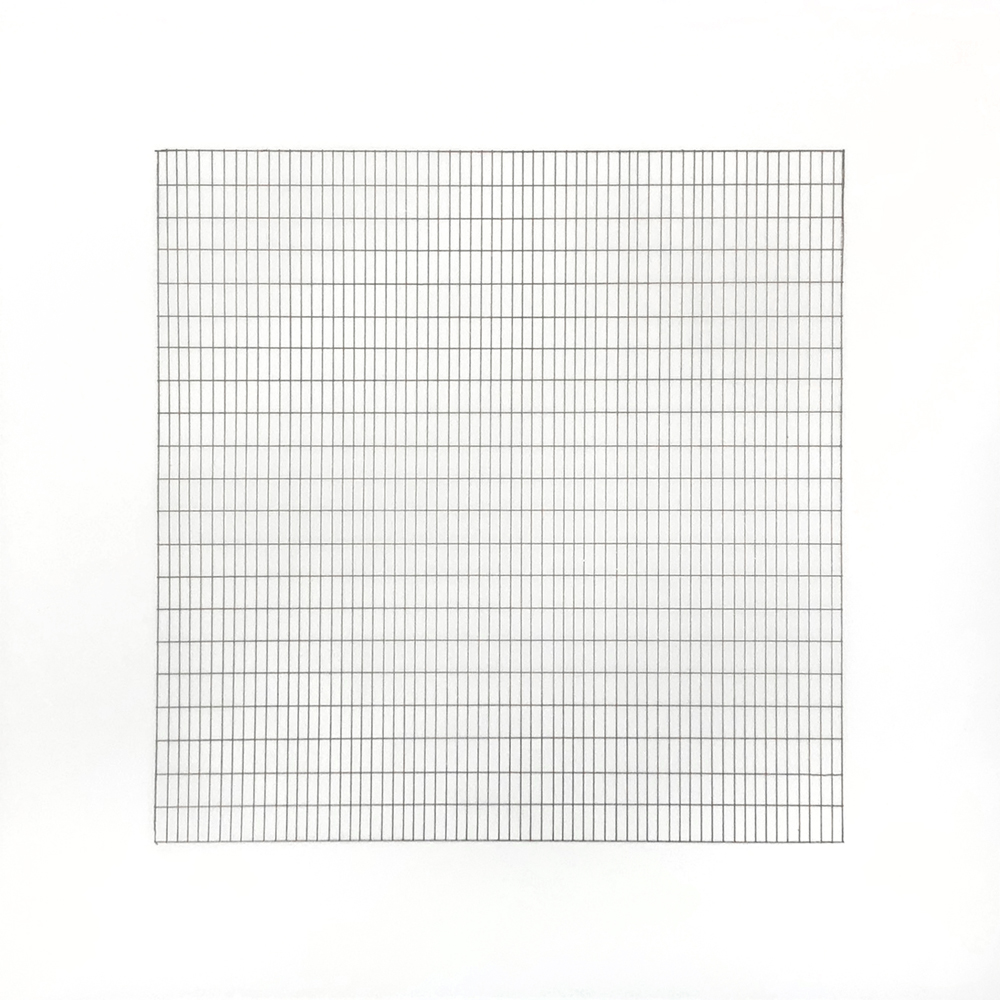 The grid's repetition recalls Agnes Martin's hand-drawn graphite fields, though here the regularity emerges not from meditative labour but from industrial die-cutting. Yet the effect shares something essential with Martin, in the way accumulated micro-units generate a shimmering visual texture that hovers between materiality and dematerialisation. The black frame surrounding each mesh panel operates as Donald Judd's edges do: defining the limits of the plane whilst refusing to subordinate the field it contains.